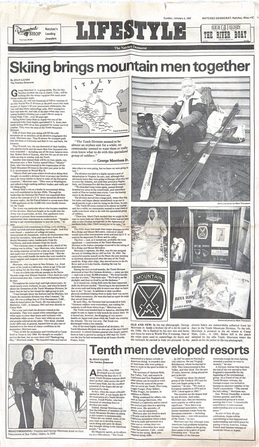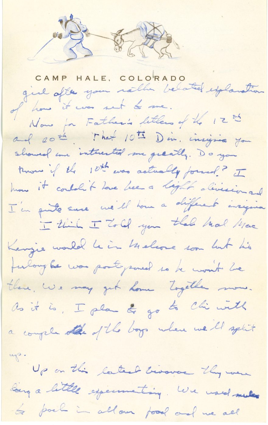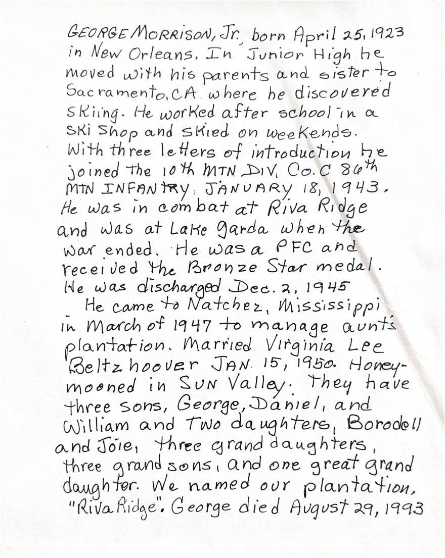 When America entered World War II, December 1941, Neuron was one of 13 Cranmore instructors who joined the newly formed 10th Mountain Division. They went to train at Colorado’s Camp Hale, and by late December 1944, Neuron was back in Italy assigned to HQ Company, 3rd Battalion, 86th Regiment. He fought in the bloody battle of Mt. Belvedere. Afterwards, since he spoke four languages, Walter spent the rest of the war interrogating prisoners.